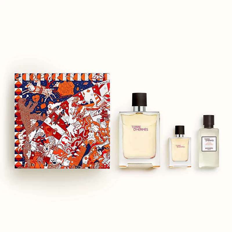 Le coffret Terre d’Hermès est composé d’une eau de toilette vaporisateur 100 ml, d’une eau de toilette miniature 12,5 ml et d’une lotion après-rasage 40 ml.